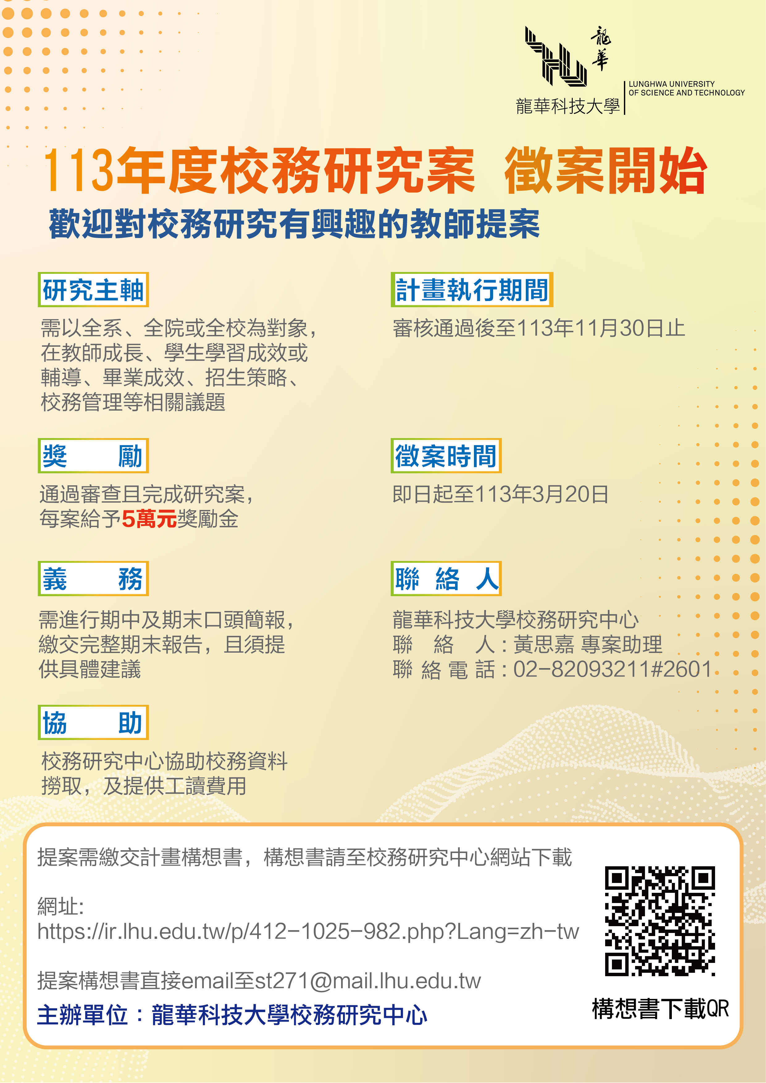 徵案時間:即日起至113年3月20日 提案需繳交計畫構想書,計畫構想書請email至st271@mail.lhu.edu.tw